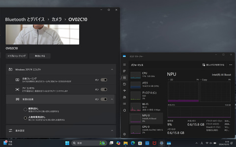 そうした場面で力を発揮するのが、Copilot+ PC準拠のノートPCが備えるNPUだ。Copilot+ PCでは40TOPS以上のAI性能をもつことなどが要件となっており、それを支えるNPUがWebカメラの背景交換などの映像処理を肩代わりできる。その分、CPU/GPUを他の作業に振り分けられ、全体的なパフォーマンスを維持できるわけだ。