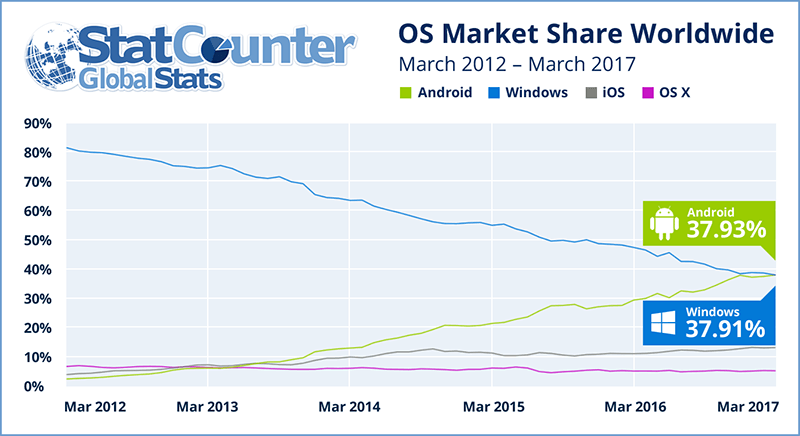 全世界OSシェア、AndroidがWindowsを抜きトップに