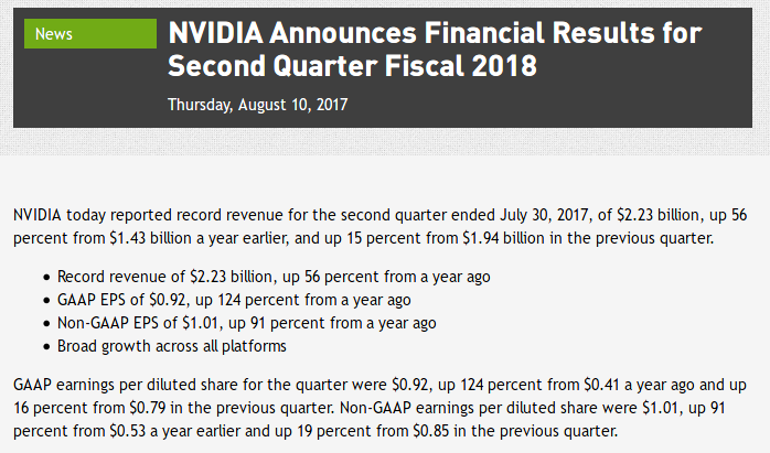NVIDIA、2018年度第2四半期の純利益は前年同期比の2.2倍を記録