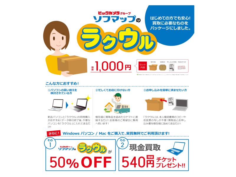 ビックカメラ、梱包材/申込用紙/宅配便送り状などがひとまとめになったノートPC買い取りサービス