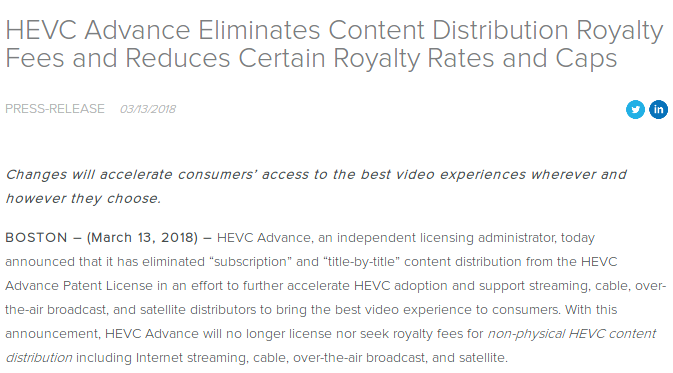 ストリーミングやTV放送で動画圧縮技術「HEVC」の特許使用料が廃止