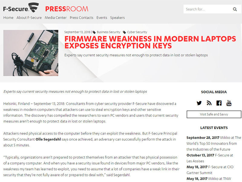 エフセキュア、スリープ状態のPCの脆弱性に警鐘。盗まれたノートから情報を抜き出される可能性