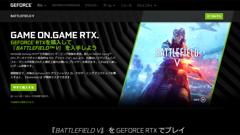 GeForce RTX購入で「Battlefield V」プレゼント、NVIDIAが展開