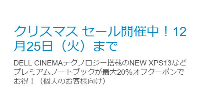 Dell、XPS13などが1週間限定で最大20%オフの「クリスマスセール」開催