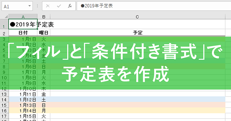【エクセル時短】オリジナルの年間予定表を作る! 日付は「フィル」、曜日は「条件付き書式」で解決