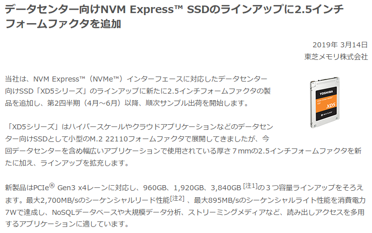 東芝メモリ、データセンター向けNVMe SSDに2.5インチモデルを追加