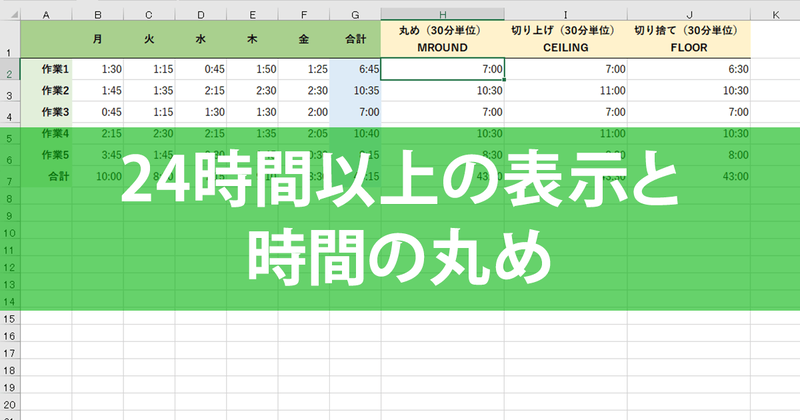 【エクセル時短】時間計算の基本。24時間を超えるときの書式設定と、切り上げ・切り捨てに使う3つの関数