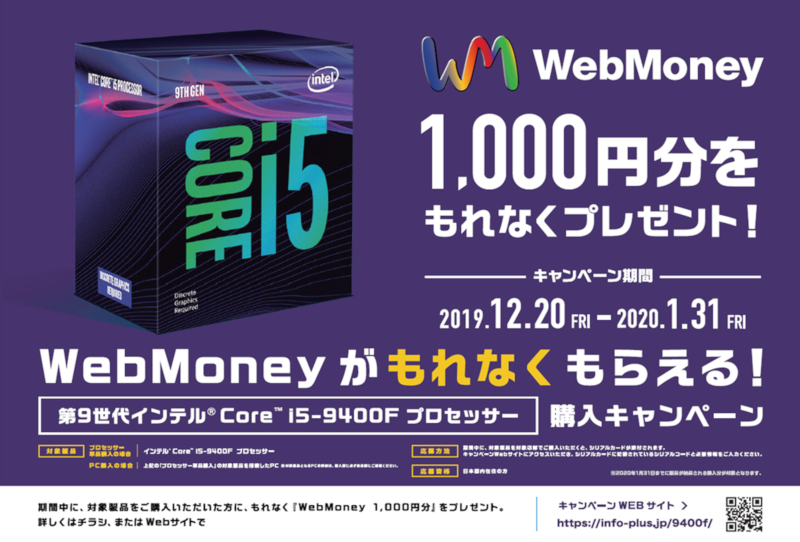 ドスパラ、Core i5-9400F購入で1,000円分のWebMoneyがもらえるキャンペーン