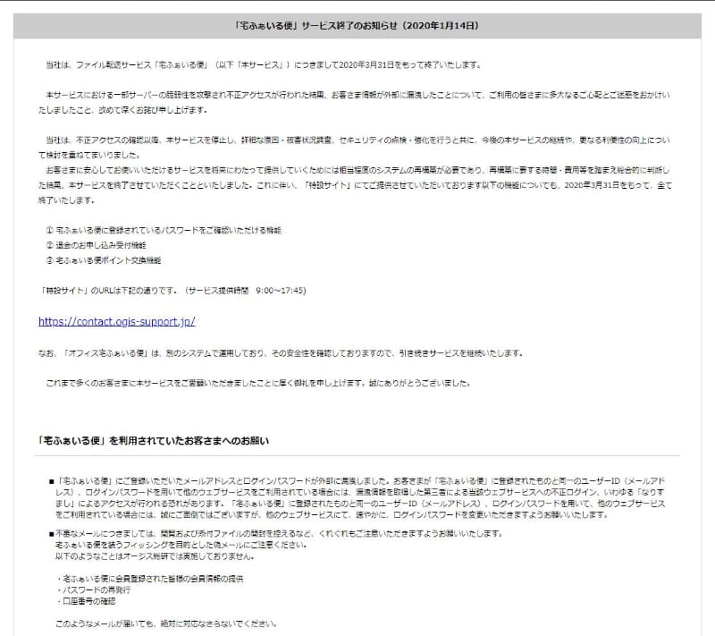 昨年1月の情報漏洩事件を受け、「宅ふぁいる便」が3月31日でサービス終了