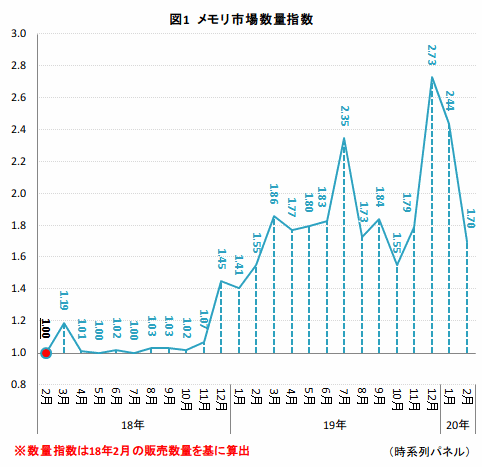 BCN、下落傾向だったメモリの価格が今年に入り上昇との分析。ただしコロナウイルスの影響で見通しは不透明