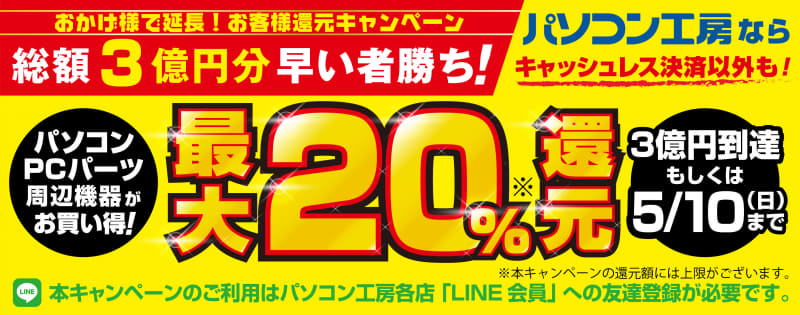 パソコン工房、購入金額の最大20%をキャッシュバックする総額3億円キャンペーンを延長