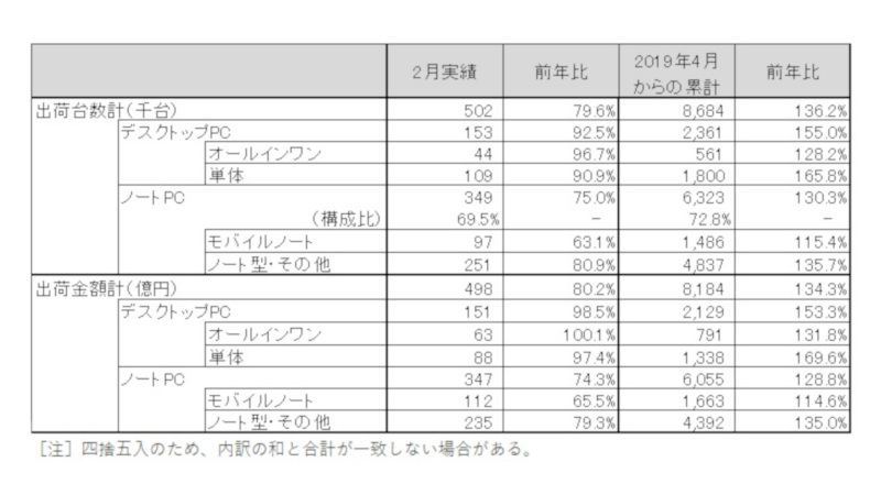 2月のPC出荷台数は昨年比の8割にとどまる。JEITA調べ