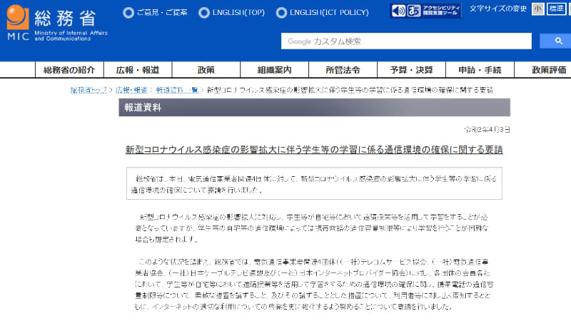 総務省、遠隔授業の実行に向けて通信容量制限の緩和を要請
