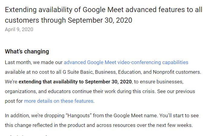 Google、オンラインビデオ会議の高度な機能を9月30日まで無償提供