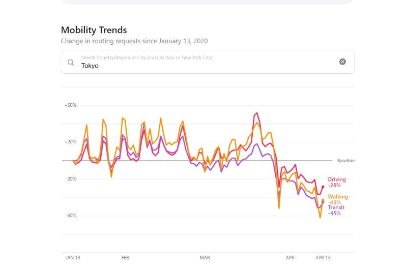 日本での公共交通機関利用率は41%減、出社は9%減