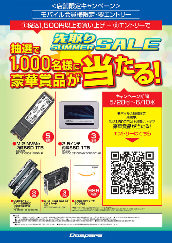 ドスパラ、1,500円以上購入で「Crucial P1」などが当たるキャンペーン
