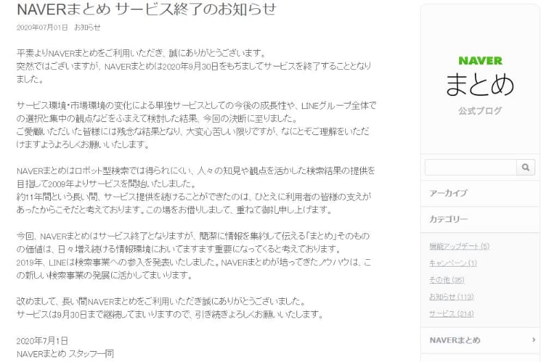 「NAVERまとめ」が9月30日にサービス終了