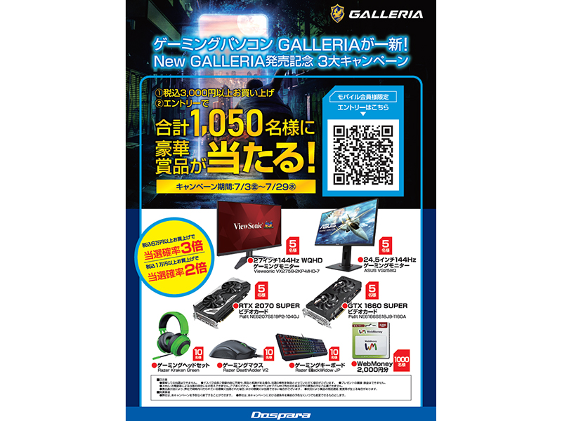 ドスパラにて3千円以上購入でゲーミング液晶やビデオカードなどが当たるキャンペーン