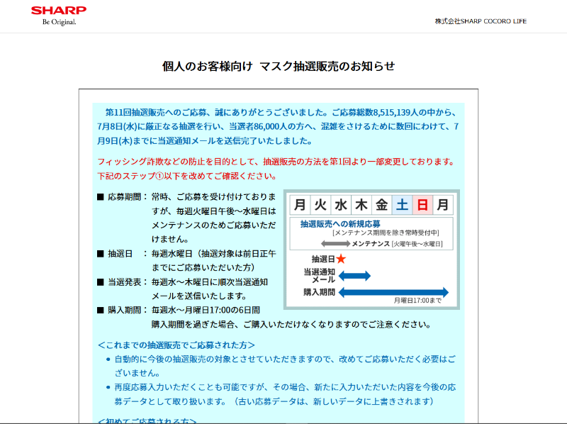 • シャープ、マスク抽選第14回目も8万7千箱を用意。7月29日実施