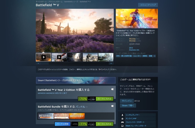 「Battlefield V」がSteamで期間限定70%オフの2,550円