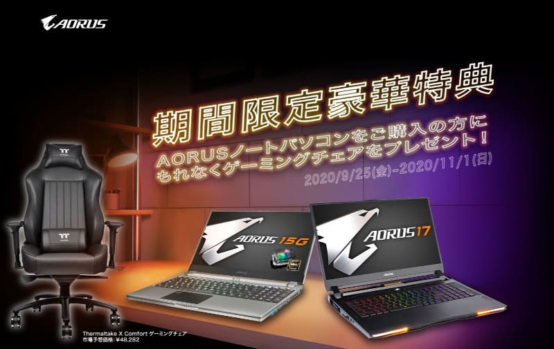 GIGABYTE、「AORUS」ノート購入で約48,000円相当のゲーミングチェアをもれなくプレゼント