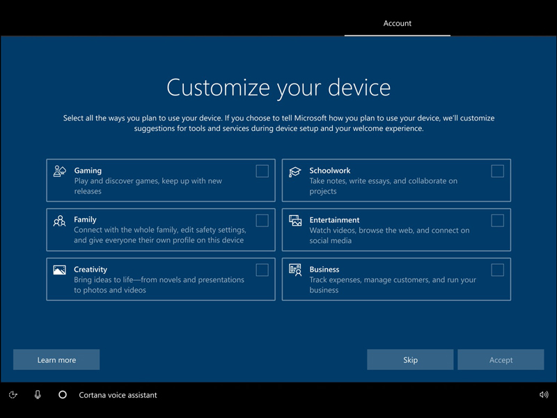 Windows 10インサイダー版、セットアップ時にパソコンの用途を選択可能に