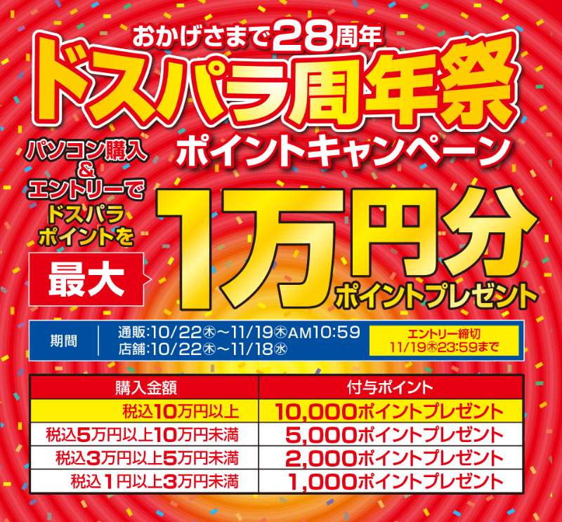 パソコン購入で最大1万円分のポイントがもらえる「ドスパラ28周年祭」