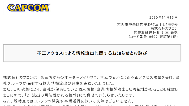 カプコン、ランサムウェア被害で最大35万件の個人情報が流出の恐れ