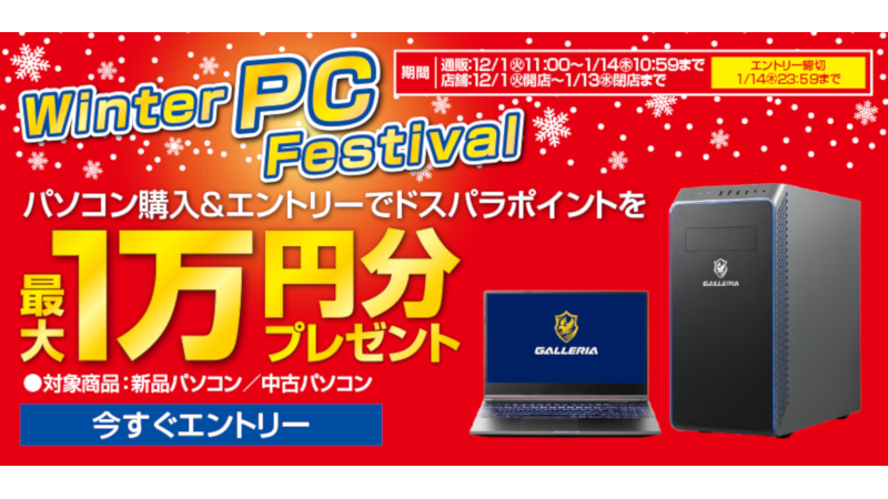 ドスパラ、パソコン購入で最大1万円分のポイントプレゼント