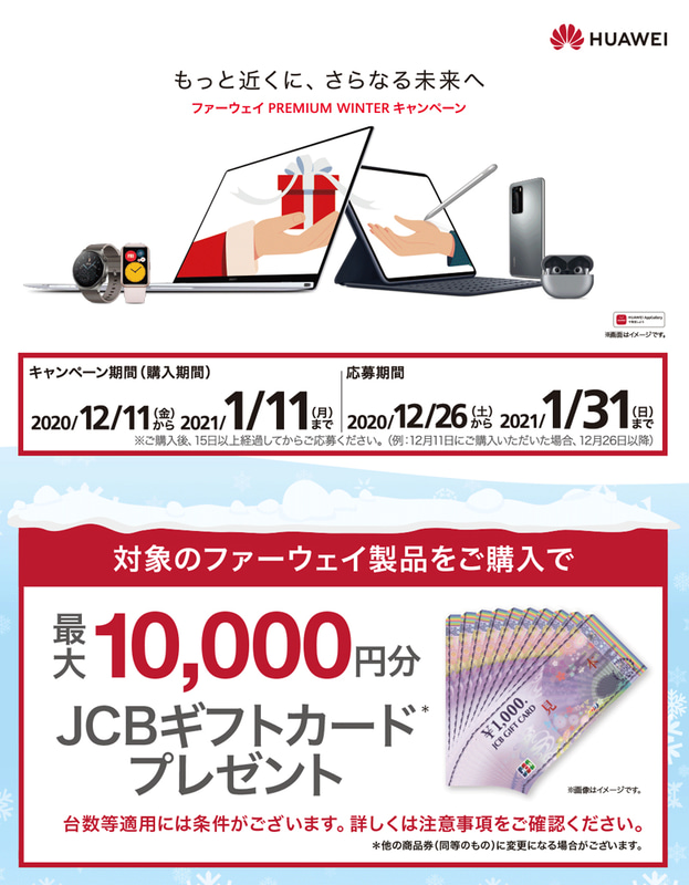 ファーウェイ、JCBギフトカード1万円分プレゼントキャンペーンなど