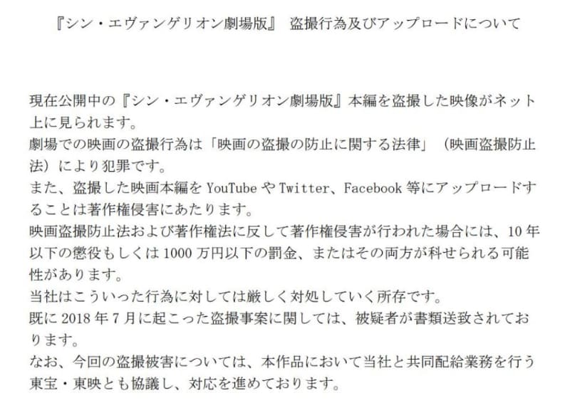 エヴァンゲリオン公式が劇場での盗撮に警告。匿名でも特定可