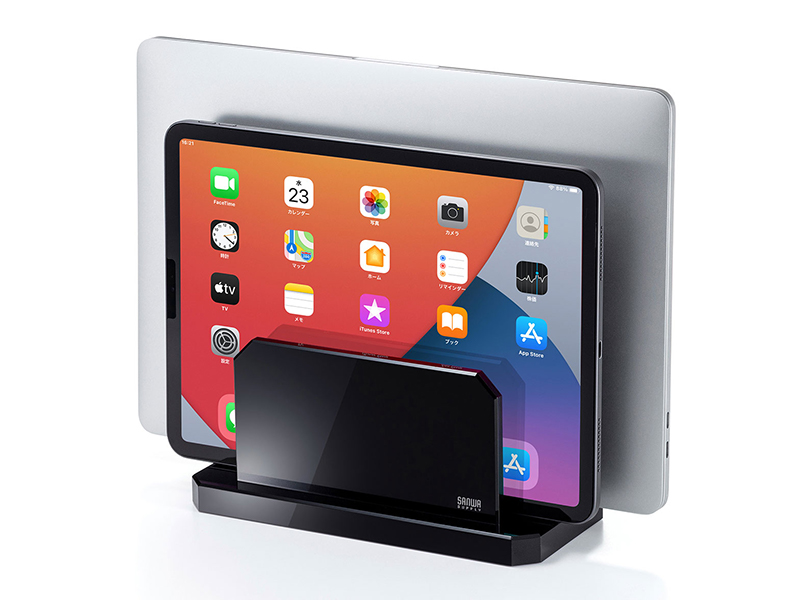 サンワサプライ、ノートPCやタブレットを2台同時に縦置きできるアルミスタンド