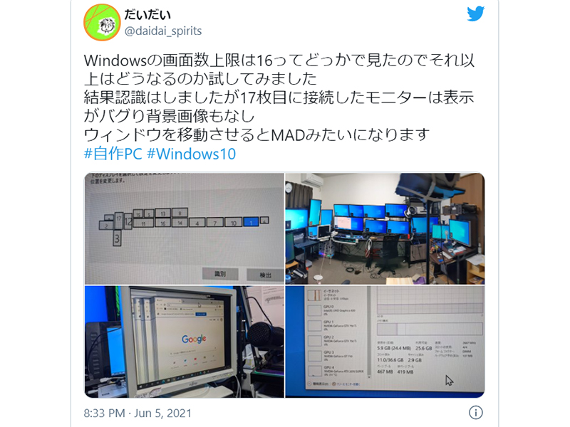 個人でPCにディスプレイ17枚の接続を試みる猛者現わる