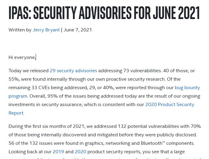 Intel、6月のセキュリティパッチで計73件の脆弱性を修正
