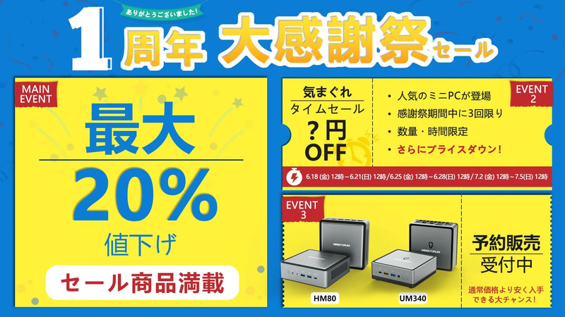 MINISFORUM公式ストア1周年記念でミニPCが最大20%値下げ