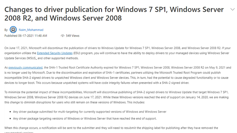 Windows 7、Windows Update経由のSHA-2署名ドライバを提供終了