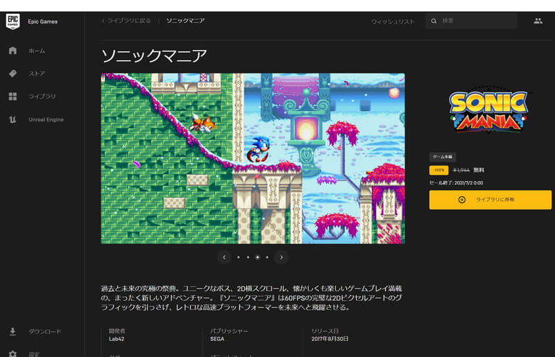 Epic Gamesストアで「ソニックマニア」が無料配布