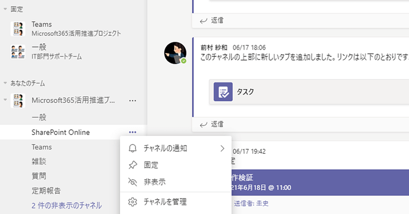Teamsで頻繁に使うチャネルは「固定」すると便利。不要なチャネルは「非表示」にもできる ほか