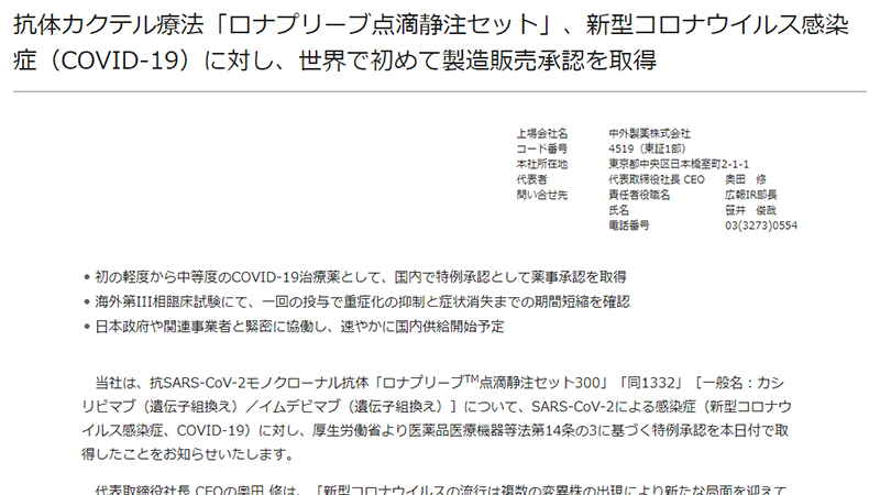 中外製薬のコロナ治療薬「ロナプリーブ」が国内で販売承認取得