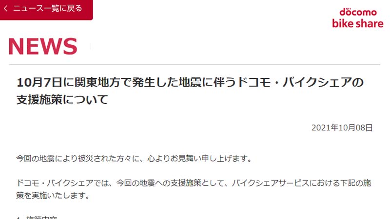 ドコモのシェア自転車、7日夜の地震発生後から翌朝までの利用料金減免