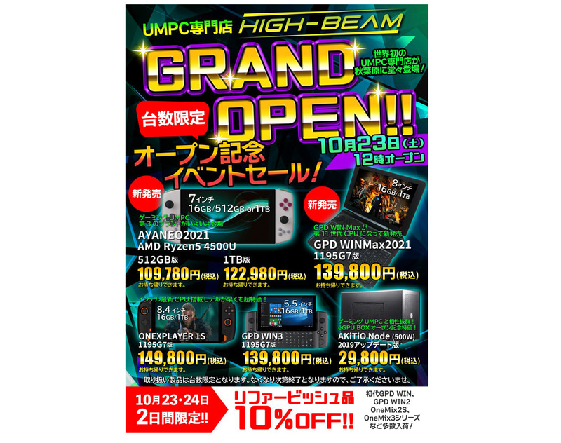 UMPC専門店「ハイビーム秋葉原店」が23日にグランドオープン。「GPD WIN 3」と「ONEXPLAYER 1S」の1195G7版を店頭販売