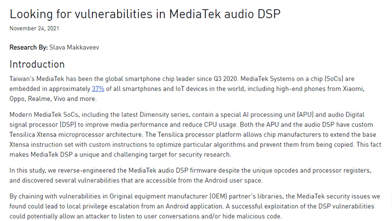 MediaTek製スマホオーディオチップに盗聴に繋がり得る脆弱性