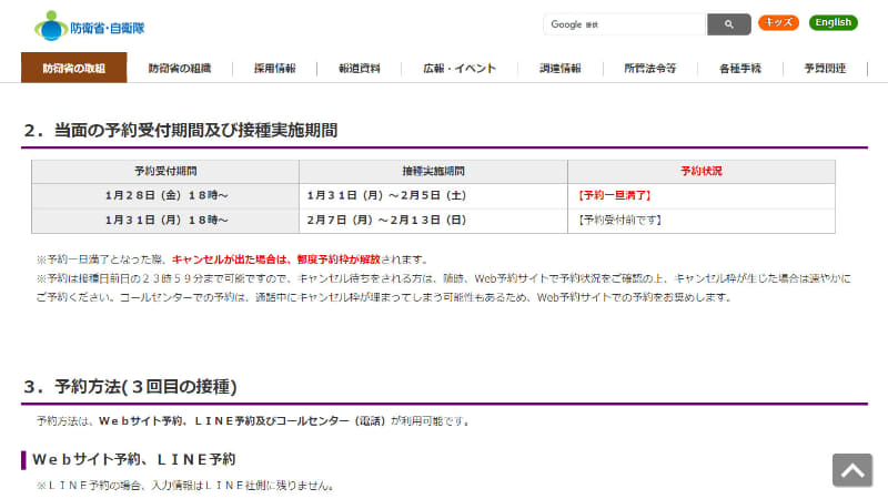 自衛隊の3回目ワクチン接種予約、本日4日18時から東京/大阪ともに受付開始