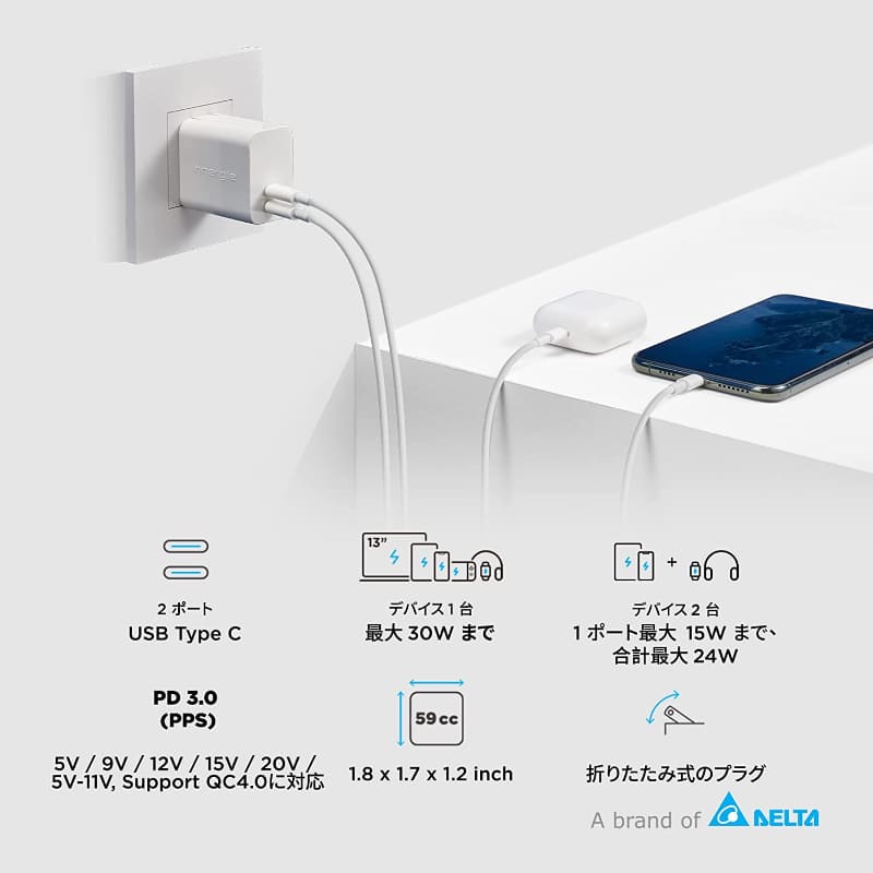 デルタ電子、GaN採用で最大60W出力の小型USB充電器
