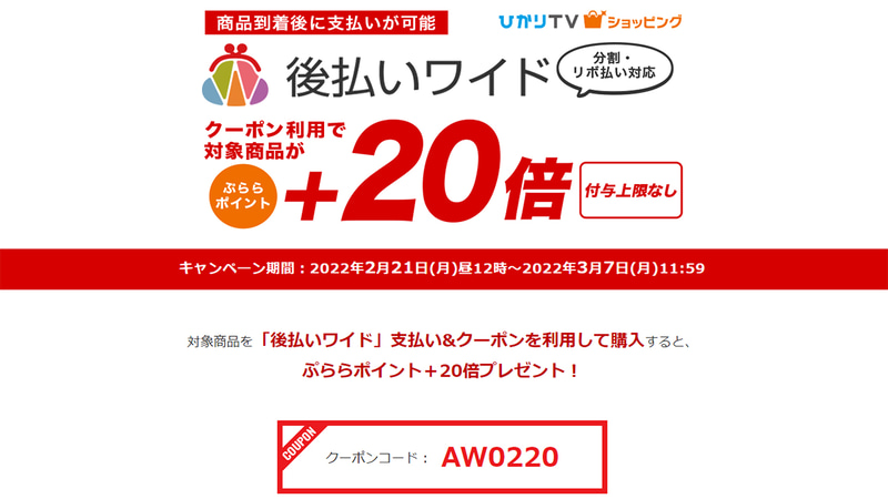 ひかりTVショッピング、後払いワイドとクーポン利用でポイント+20倍のキャンペーン