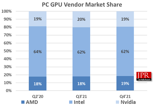 2021年第4四半期のPC向けGPU出荷台数は前年比15%減。シェアは横ばい