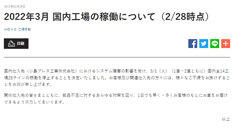 トヨタ全国内工場が、仕入先へのサイバー攻撃で稼働停止。2日以降再開へ