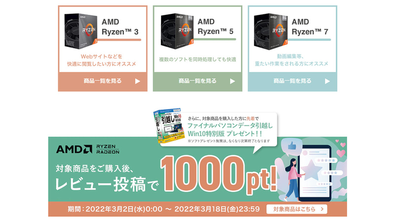 ひかりTVショッピング、Ryzen搭載PC購入とレビュー投稿で1,000ポイントを贈呈