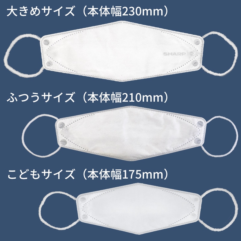 • シャープ、大きめ/ふつう/こどもサイズのマスクが各15枚入りのセット