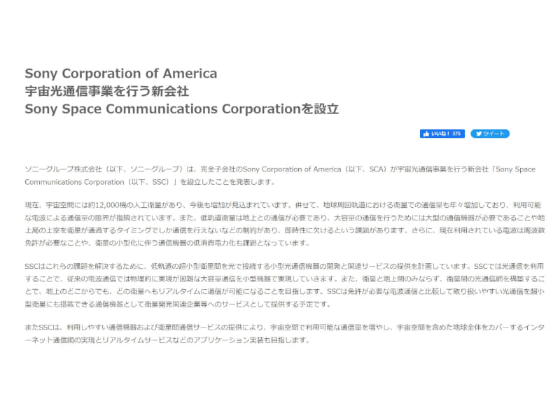 ソニー米子会社、宇宙光通信事業の新会社設立